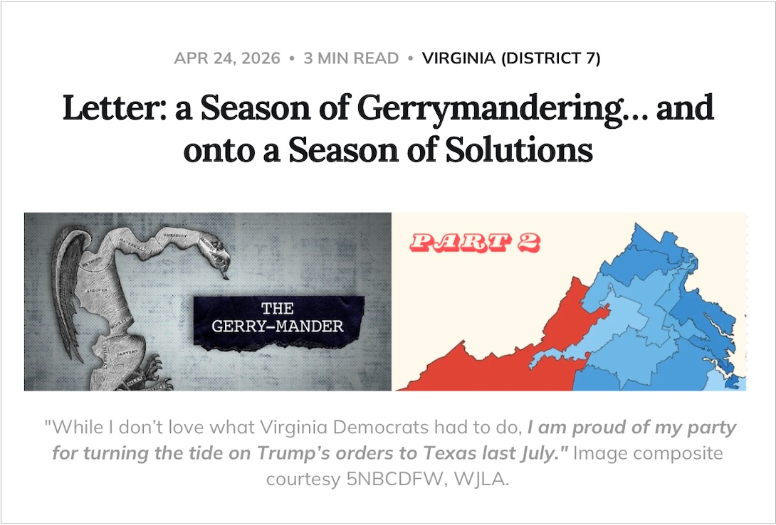 Image composite accompanying the Falls Church Independent opinion piece on Virginia redistricting.